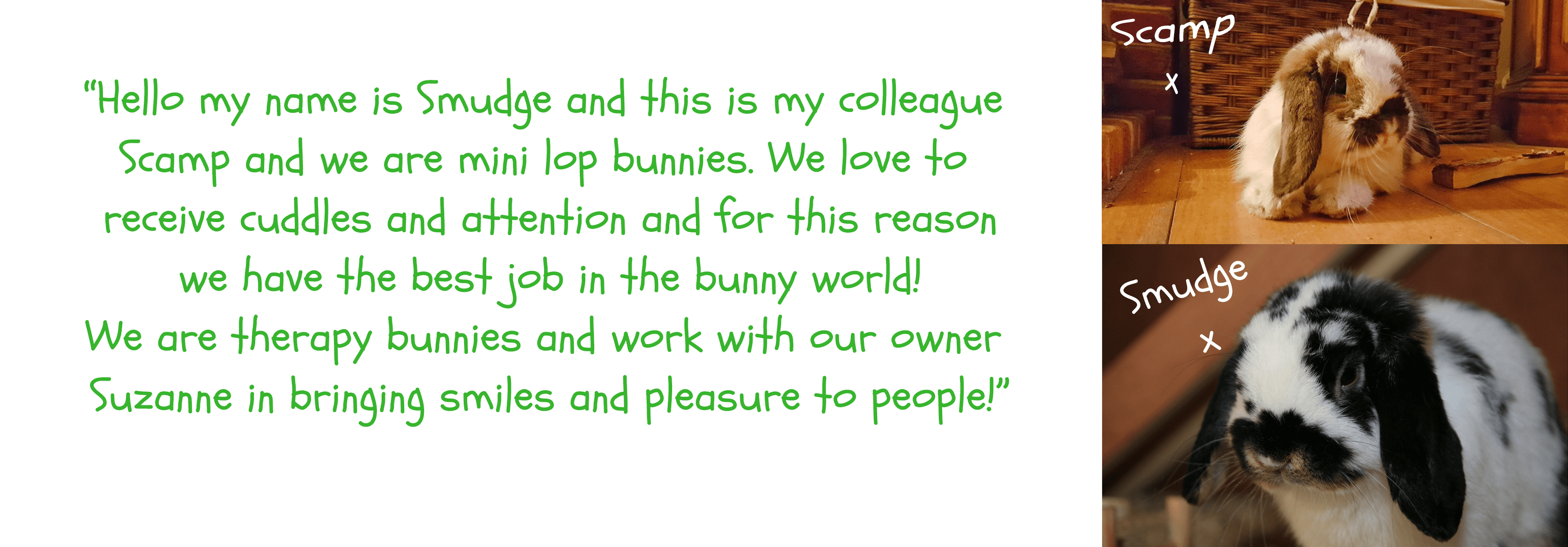 Our bunny therapy service is named after the wonderful “Sweet Pea”. She was the founding bunny and her legacy and memory lives on with the fantastic work we do.