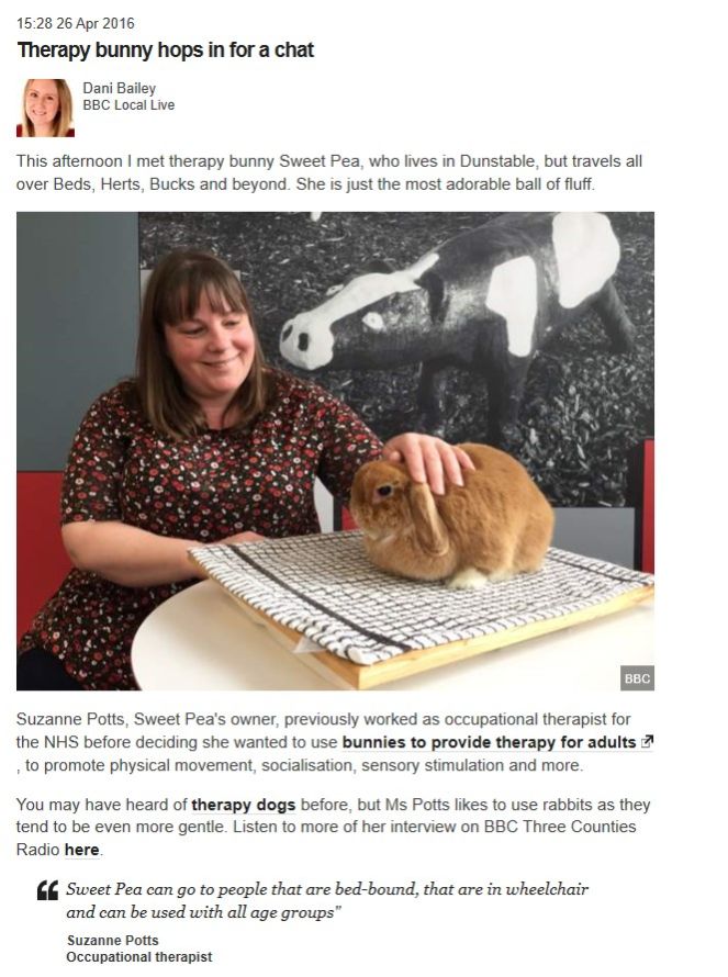 Thank you to my clients for all your valued support over the last 6 years. I am very proud of the bespoke occupational therapy support and services I have provided to many individuals and their families over the years. This includes our wonderful “Sweet Pea Therapy Bunnies” service. Due to a change in circumstances I will be no longer providing Potts OT Services for the foreseeable future. Please contact the Royal College of Occupational Therapists using the following link https://www.rcot.co.uk/about-occupational-therapy/find-occupational-therapist to use their “find an OT” search facility.